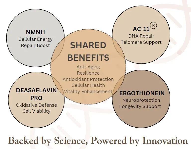 Deasaflavin Pro and Ergothioneine, known as the "longevity vitamin," deliver powerful antioxidant properties that combat oxidative stress, keeping you resilient against life’s challenges.